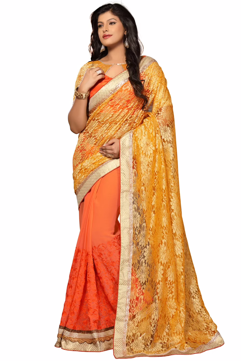 Akriti Orange & Yellow Traditional Saree With Matching Blouse Piece For Ladies,Girls,Women at Seasonsway.com .