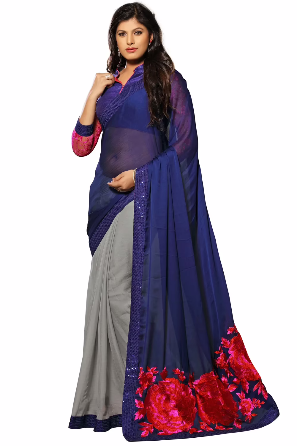 Saree Features:Royal blue & Grey Colour Chiffon Occation Wear Traditional Saree With Matching Blouse Piece. KNOW YOUR PRODUCTS: Products Quality – We sell only Brand New High Quality Fersh Fashion Products.