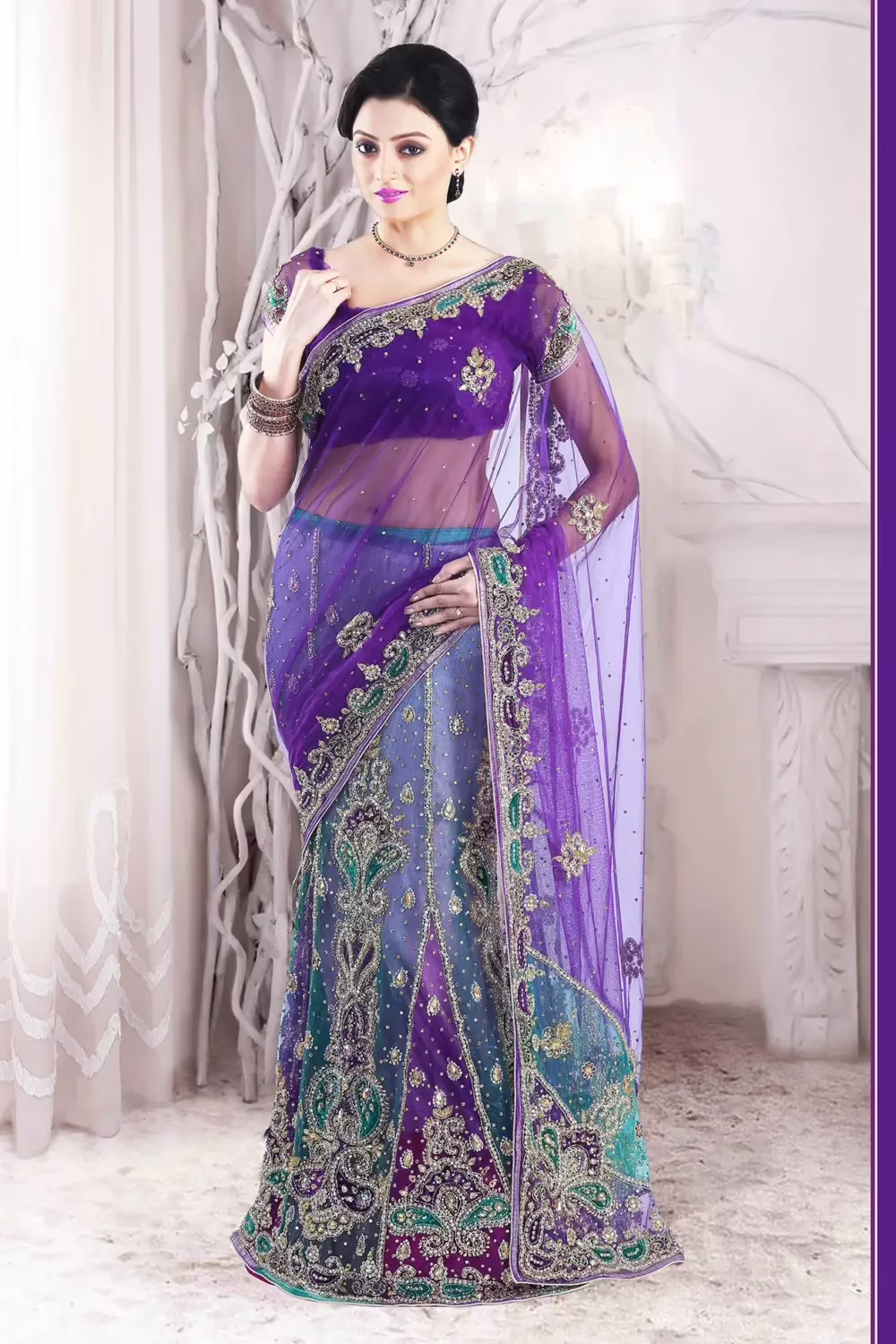 Saree Features:Amethyst Violet and Robin-egg Blue embroidered party lehenga style saree intricate with zari thread, resham thread, sequins work, beads work, stones, moti work, floral work, leaf work, keri work and border work.Lehenga style saree comes with an unstitch blouse piece of Net fabric which can be customised as per your requirement.