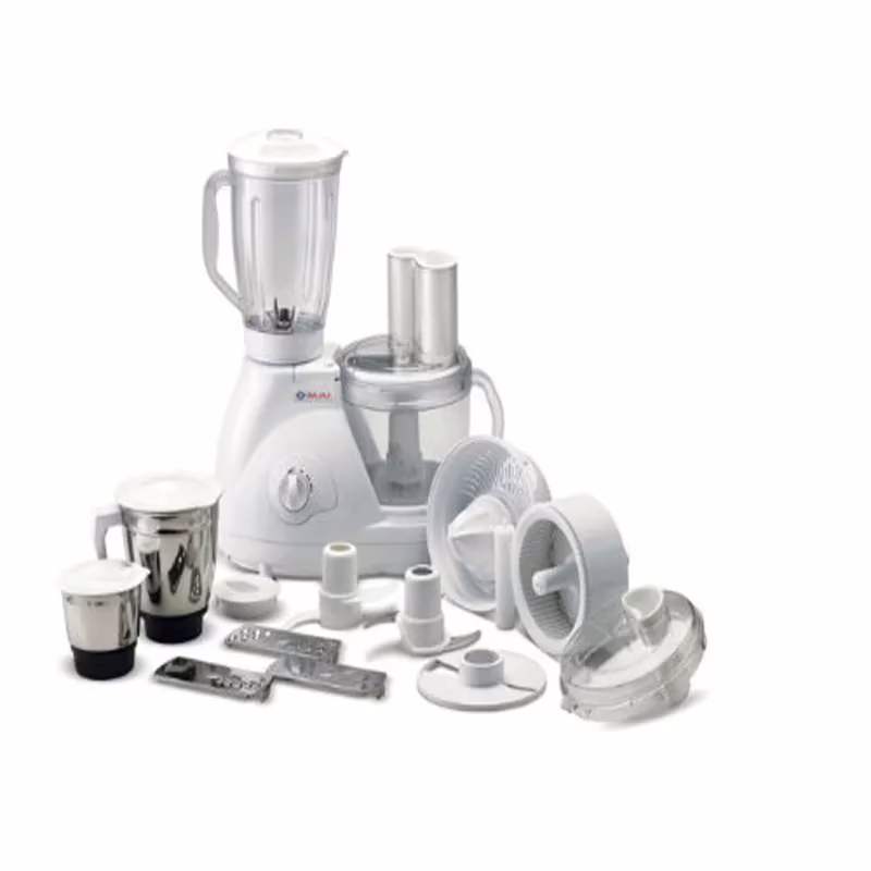 The Bajaj FX 11 can perform multiple functions for you. Chop, slice, shred and grate all your vegetables and other food items with ease. You can whip creams for cakes and pastries, and prepare delicious batters, purees and chutneys with the multiple processing jars available. Also, the Bajaj FX 11 food processor comes with multiple detachable knife blades, each made of high-quality stainless steel to dice and cut vegetables with the slicing, chopping, kneading and shredding blades. Moreover, you can also prepare delicious fruit and vegetable juices for your family with the centrifugal and citrus juicers.