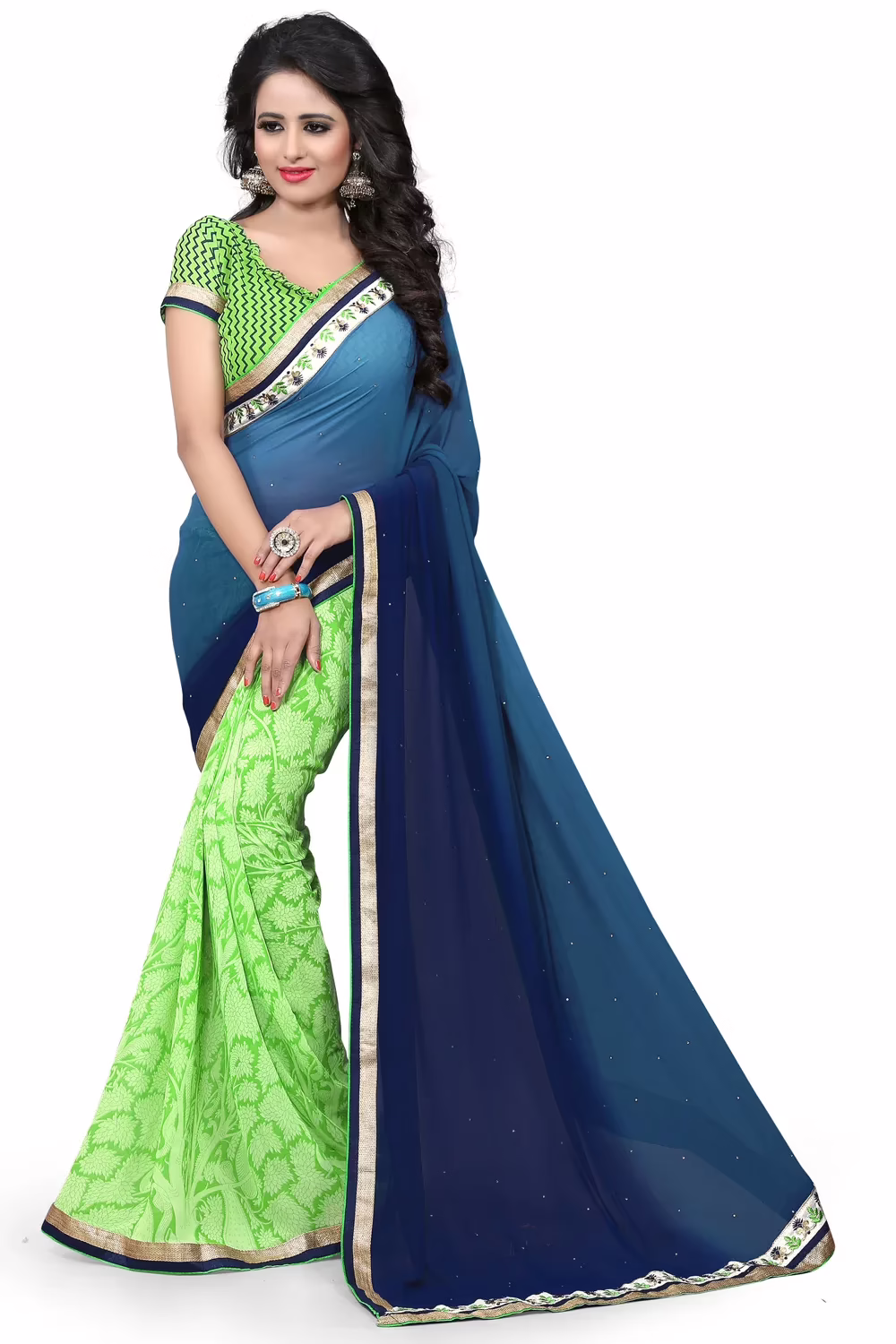 Saree Features:Blue & Green Colour Georgette Printed Half & Half Occation Wear Saree With Matching Blouse Piece. KNOW YOUR PRODUCTS: Products Quality – We sell only Brand New High Quality Fersh Fashion Products.