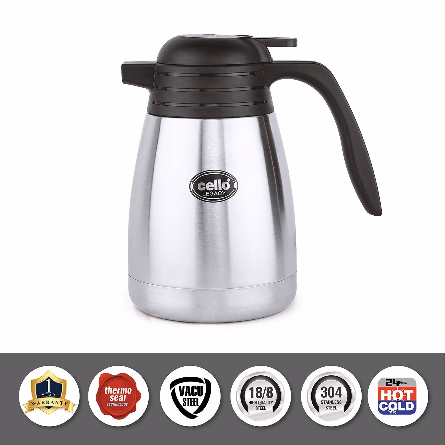 Cello Legacy Vacusteel Flask features double walled vaccum insulation with inner copper coating that retains the temperature, keeping beverages hot or cold for a prolonged period of time. This reusable double wall carafe is made with thermo seal technology & high quality steel ( 18/8). Ideal for hot & cold beverages. Pour spout opens easily with push button and firm grip handle that makes one handed pouring simple and convenient. This tea-pot features a threaded lid for easy open and close. This Tea pot features an ergonomic easy grip handle. Keep water hot and cold for 24 hrs. Easy press and pour spout. 100%vacuum insulated Stainless Steel body.