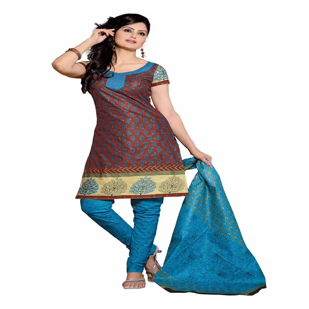 Cotton Bazaar Light Brown & Sky Blue Pure Cotton Un-Stitched Salwar Suit
