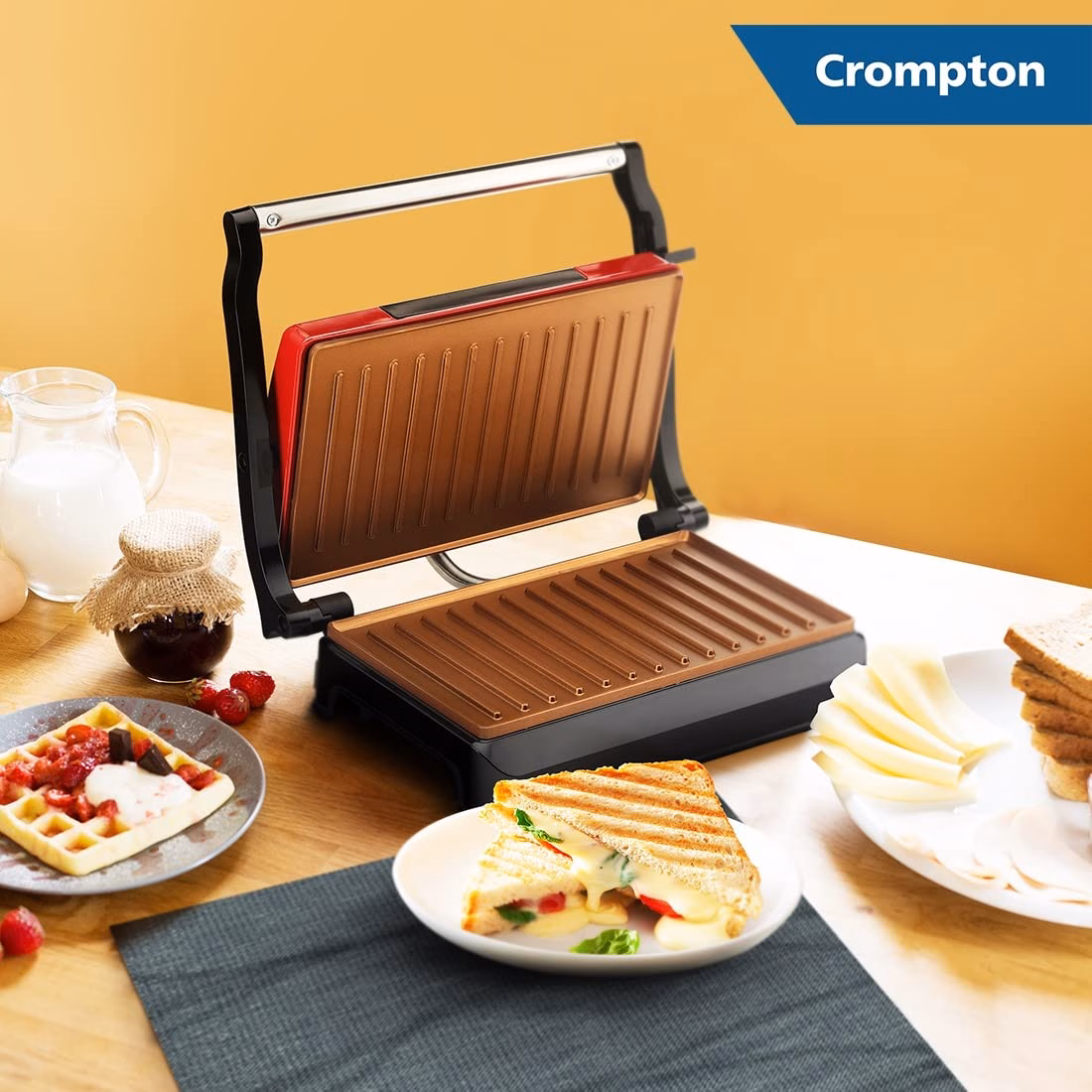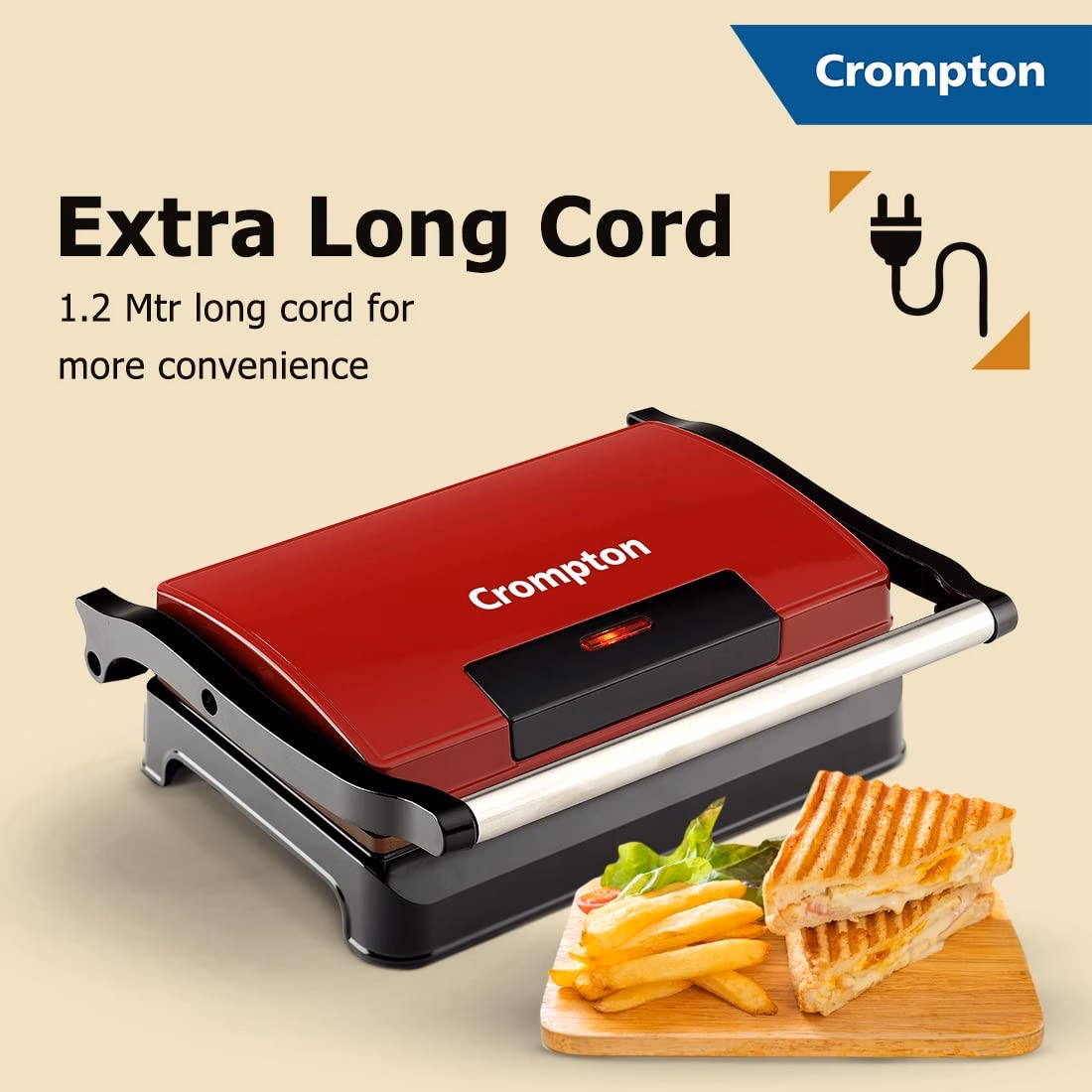 Crompton? sandwich toaster has a 800-watt heating element that provides the perfect toasting to your sandwich. In addition, it is equipped with a floating hinge that prevents the cover from smashing the sandwich and spilling the filling. This allows you to make a generous and healthy stuffing for your sandwich. Enjoy making a heavy sandwich that is filling enough for big lunches and dinners. Along with this, you don? need to worry about health problems in regularly toasting your sandwich in a sandwich machine, as we have a golden food-grade coating, making it safe to use routinely. In addition, you do not need to worry about cleaning your sandwich maker after making sandwiches, as the premium non-stick food-grade coating allows easy cleaning of the tray. If you?e running out of options for your sandwich fillings, here are some healthy and delicious sandwiches you can make QUICK serve Sandwich maker has GOLDEN FOOD grade coating which helps in making healthy and ?crisp sandwiches thereby maintaining hygiene and convenience. Sandwich maker comes with 2 indicators. QUICK serve Sandwich maker comes with powerful heating element of 700 watts which delivers quick heating and healthy & crisp sandwiches in no time.