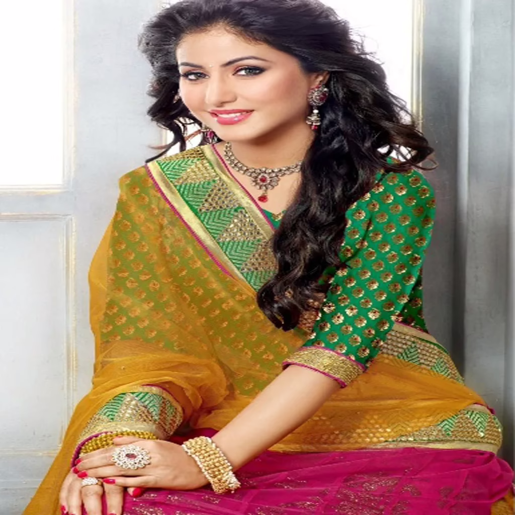 Suit Features – F3 Fashion pnk lahenga with green blouse on yellow dupatta intricate with resham thread & neck work & patch patti border.This unstitched party wear long suit can be stitched upto burst size 44 Inches.Available with chiffon dupatta.There might be some color variation..
