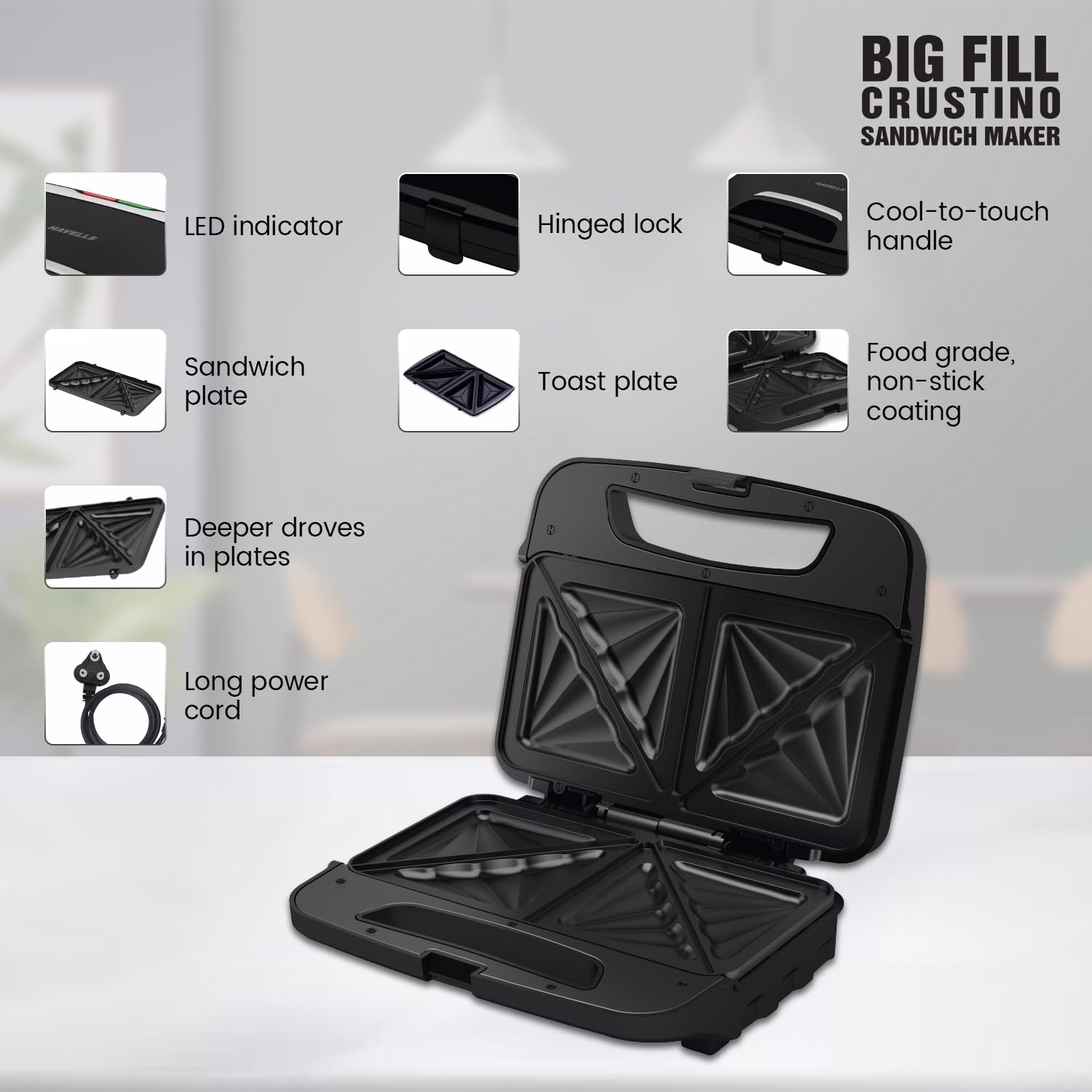 Havells BigFill Crustino Sandwich Maker 900W with Food Grade NonStick Coated Sole Plates Toast?(Black)