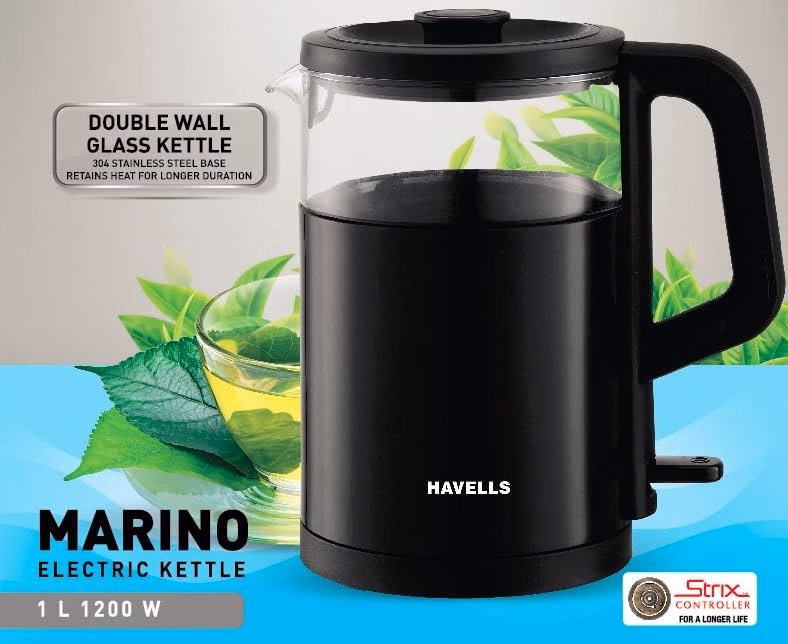 Robust Internal Borosilicate Glass Body with 304 Grade Stainless Steel Kettle Base. With Worlds One Of The Best Strix Controller. Wider Mouth with Detachable Lid for Easy Cleaning and Filling. Double Wall Internal Glass Body with Plastic Outside for Cool Touch. Slip free Base. Dry Boil Protection. With Cord Storage . Lift Of Switch Of (LOSO) Function. 1200 Watt.The stainless steel lid of this electric kettle can be opened with a single press of a button, adding to the ease of use. Featuring an on and off switch along with a light indicator, this electric kettle lets you know whether it is on or off. If you use this electric kettle without water or allow it to boil dry, then its boil dry protection feature protects it from damage. Thanks to its auto shut-off function, this electric kettle automatically switches off to protect from damage when the water has come to a boil. Its stainless steel interior pot ensures to keep beverages warm while adding to the overall aesthetics of this electric kettle. In addition, featuring a stainless steel lid, which is easy to open with a button, this electric kettle ensures a user-friendly experience. Moreover, the auto shut-off function of this electric kettle ensures outmost safety.