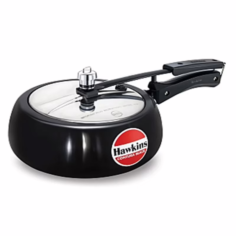 The Hawkins Popular Aluminium pressure cooker has a shiny Black exterior, which
