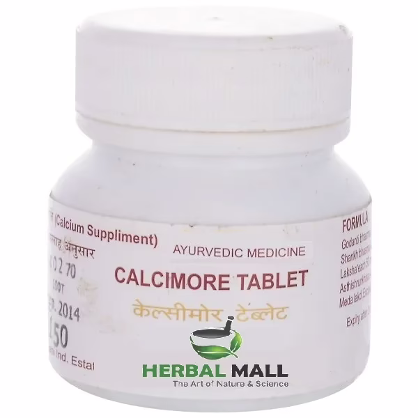 Herbal Mall Calcimore (100 tablets): Calcimore (100 tablets) Note: The date of manufacture and price shown in the image are outdated. Rest assured that the product you will receive will be of the newest manufacturing date. Calcimore is our proprietary Ayurvedic formulation that acts as a natural Calcium supplement. Useful in osteoporosis, bone/joint pain and bone decay due to age Strengthens bones and joints Regular use for women over 40 years recommended.