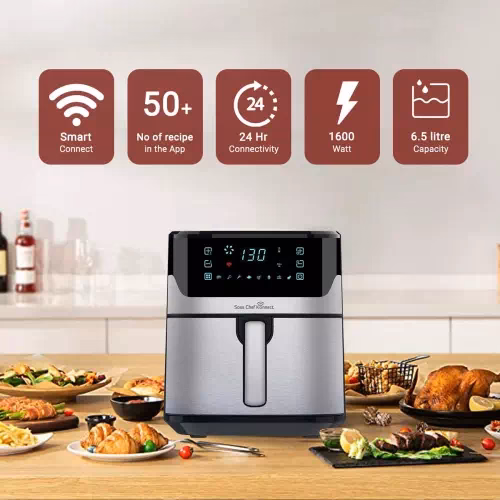 Thanks to its Rapid 360? air circulation heats design Inalsa Sous Chef Konnect air fryer is a complete space saver. With 6.5 L basket capacity it is a perfect match for up to 4-5 members family. Tap,Cook. Pretend you’re a pro because now,in a sense,you are. Use the Taurus Smart App to browse through more than 50+ simple-to-make air fryer recipes. Try tender steaks,flaky fish,crunchy fries or lightly browned vegetables. There are quick breakfasts,appetizers,entrees,and desserts. Perfect meals,every time. No guesswork involved. Sous Chef Konnect Air Fryer Oven uses the circulation of hot air to cook food that would otherwise be submerged in oil,which reduces intake of 99% of oil and calorie while keeping its crispy taste and makes it possible to enjoy your food without guilt. Sous Chef Konnect air fryer does everything you can expect from any good air fryer. With 8 pre-set cooking function we guide it to perfection. It can Steak,Chicken,Seafood,Shrimp,Bacon,Frozen Foods,French Fries,Vegetables,Toast,Bake,Preheat,Keep Warm. Industry leading Taurus Connect App lets you control the air fryer remotely. Adjust time and temperature,read in-app recipes,and keep an eye on the cooking process from anywhere Yes,even outside your home. Then start cooking tasty meals with a single button. To access the choices for remote control on your smartphone,you can download the Taurus Connect App Powerful & Mighty 1600W powerful motor torque engineered for same crispy results every time.