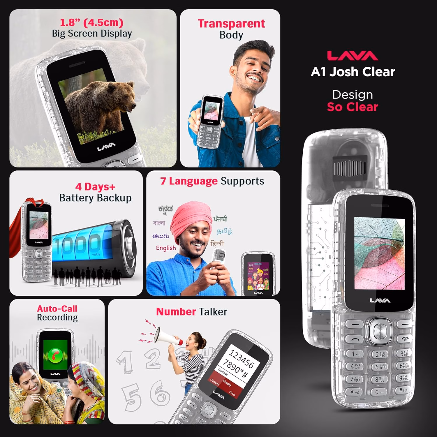 A sleek, transparent body crafted from resilient materials & A transparent keypad, designed for intuitive use, ensuring a smooth user experience. Speaks when you press any key and can read messages aloud for easy interaction. Smart AI Battery helps Efficient battery management for extended talk and standby time. Enjoy your favorite stations and stay prepared with the torchlight feature. Sturdy, pocket-friendly form factor ideal for daily use.