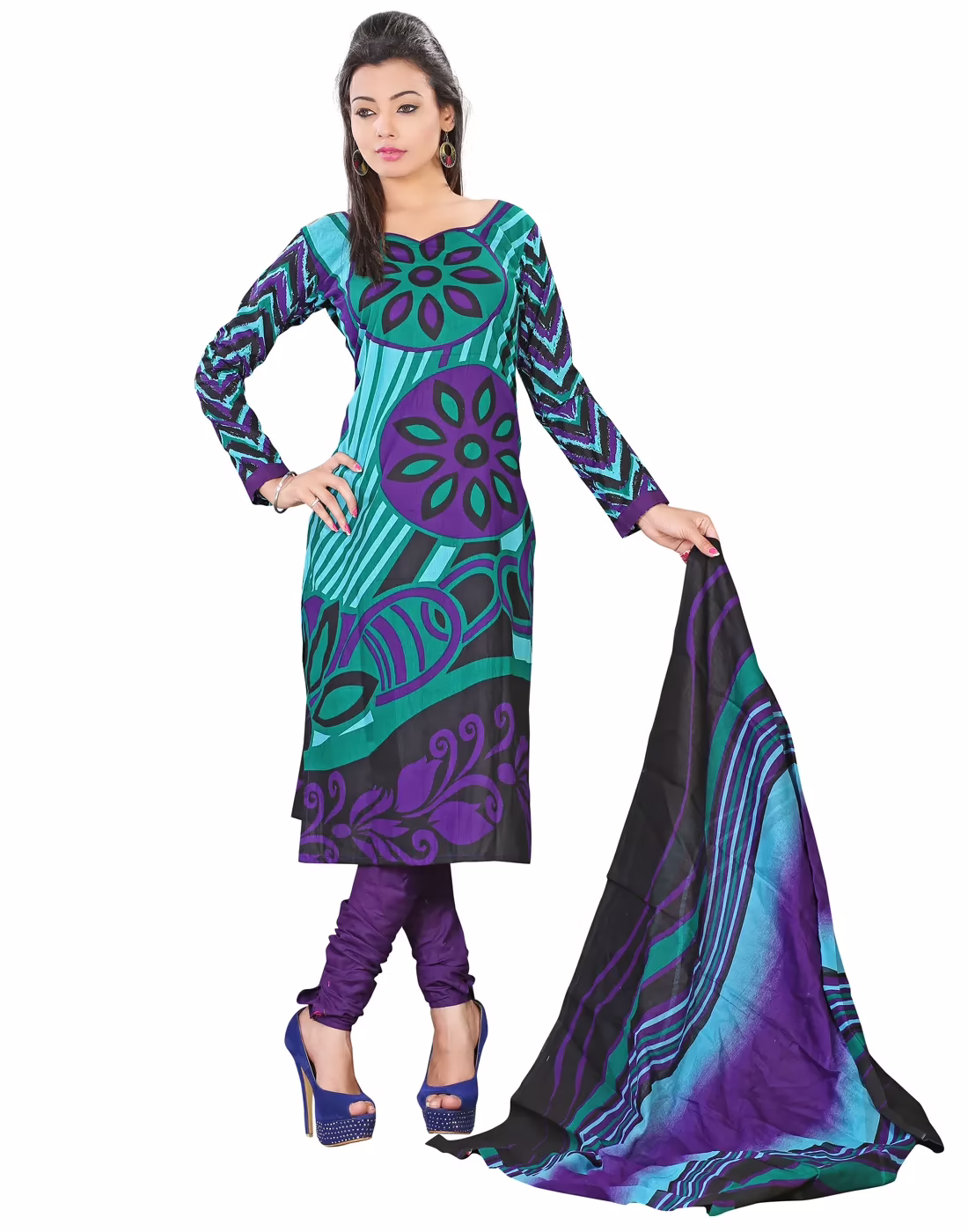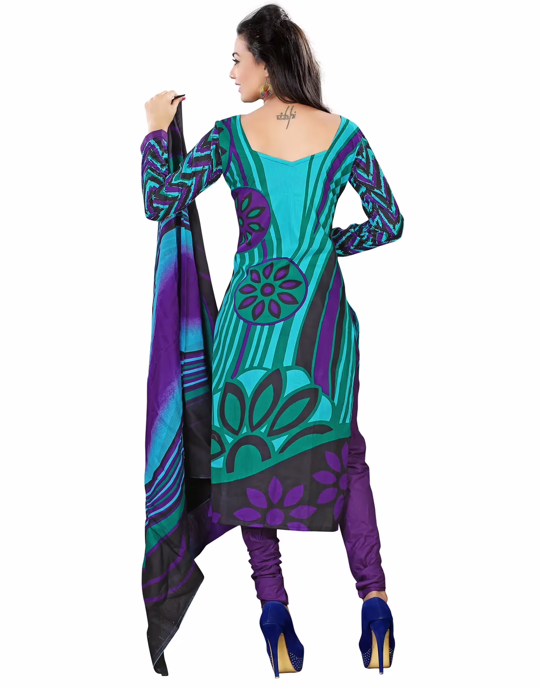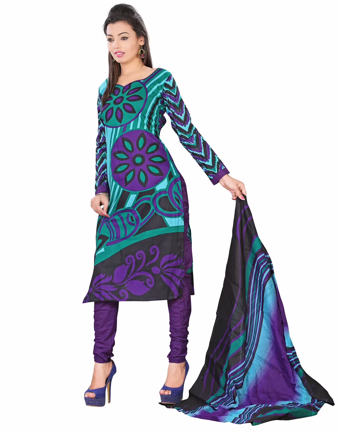 Feel the ethnic touch with the apparel that comes with superb cotton material on its top, bottom and chiffon on dupatta to give relaxing feel. The suit hugs turquoise, black & purple color touch that really gives stunning look and appeals showers of compliments.