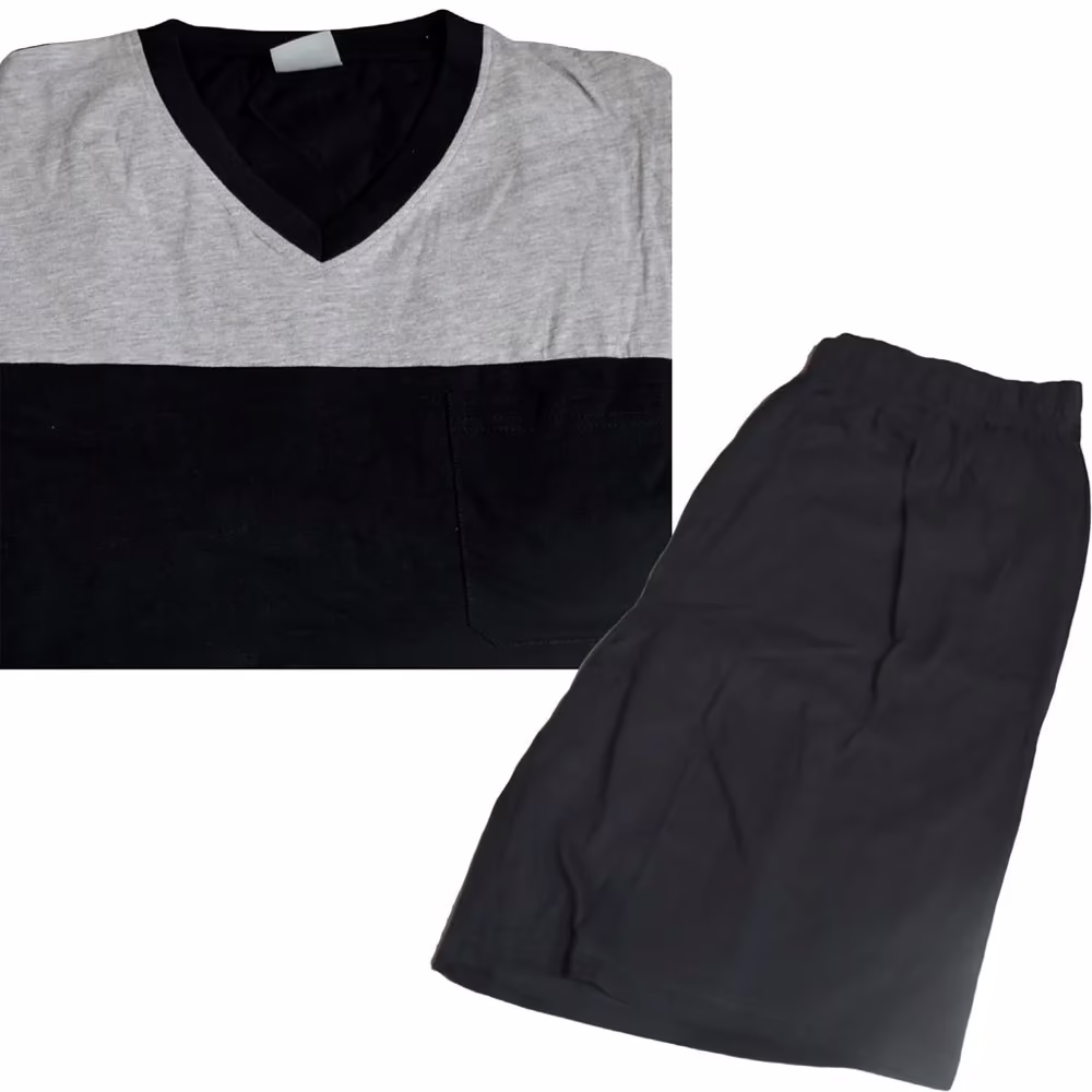 A perfect pick for both sleepwear and loungewear this season is this Maddison Black Grey Coloured  night suit .. While the V-neck pattern on the T-shirt lends this suit its eye-catching appeal, the organic cotton fabric assures a soft, comfortable wear. This night suit comprises T-shirt and bottoms.