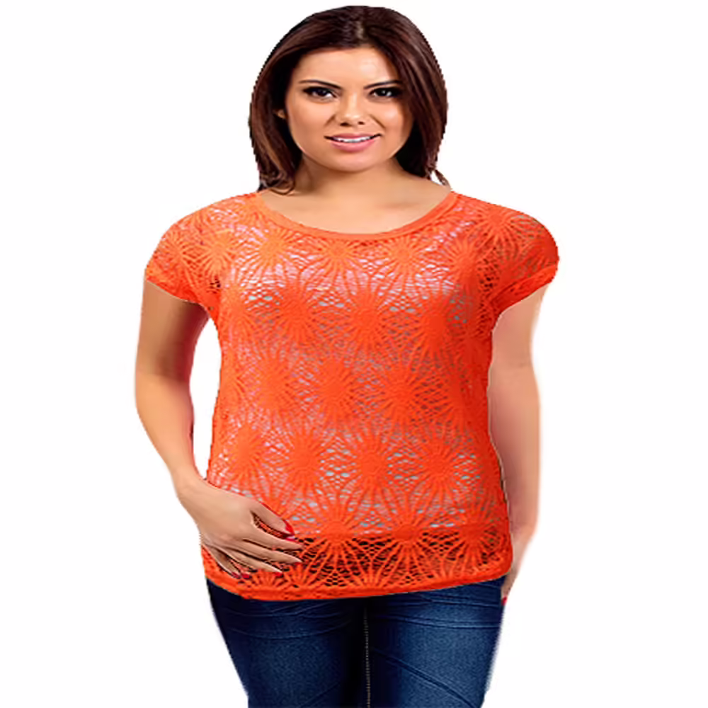 Crochet Top Features round neckline,short sleeves,Orange Color with fine cotton blended mesh detailing.