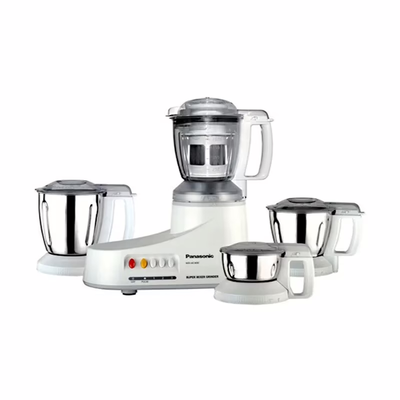 Bring home the Panasonic MX-AC 400 Super Mixer Grinder to turn the gruelling task of crushing, grinding and blending easy. Its powerful 550 W heavy duty motor along with Samurai Edge blades ensure that even the toughest work like grinding whole spices is done in minutes. These hardened steel blades stay sharp for life. Â It comes with 4 jars that have unique interlocking safety system. The safety system ensures that motor will start only if the jar is properly locked. It prevents accidental switching on the appliance and thereby makes it very safe. Â Its safety lid locking system along with magic seal protection makes sure that nothing spills out of the jars while the motor is running. It has flow breaker jars that offer more effective grinding.