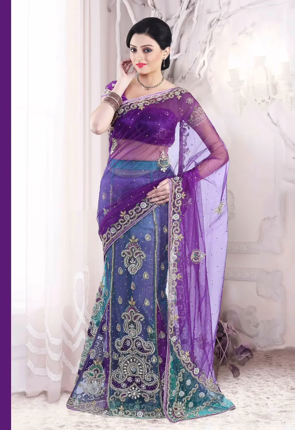 Saree Features:Amethyst Violet and Jungle Green embroidered party lehenga style saree intricate with zari thread, resham thread, sequins work, beads work, stones, moti work, floral work, leaf work, keri work and border work.Lehenga style saree comes with an unstitch blouse piece of Net fabric which can be customised as per your requirement.