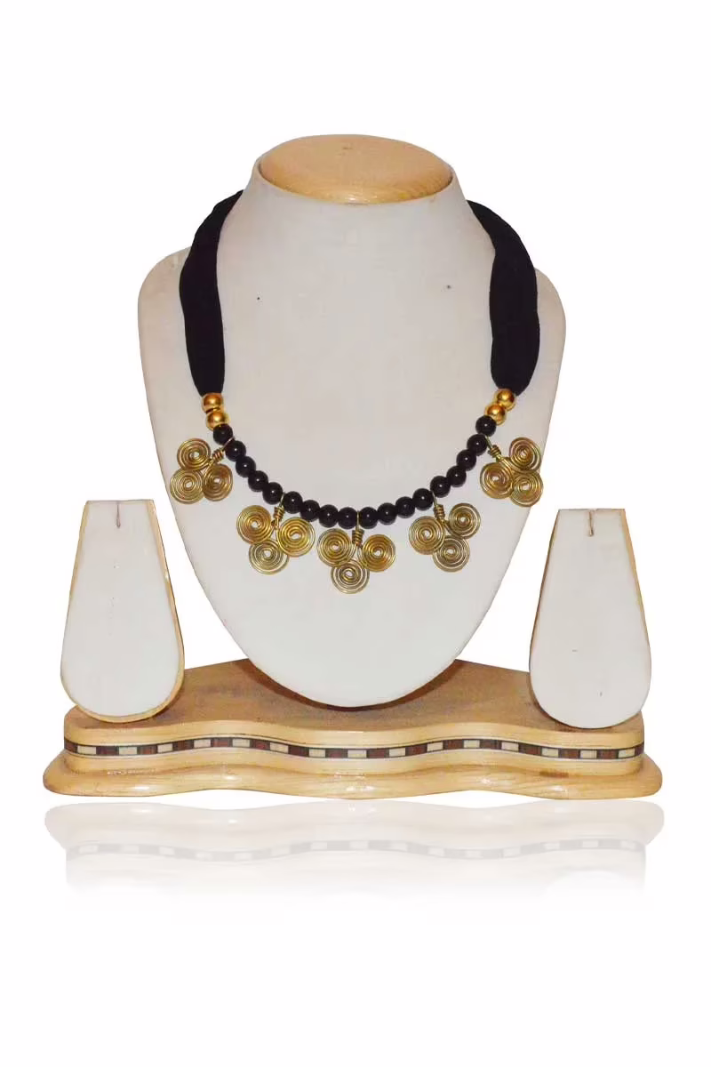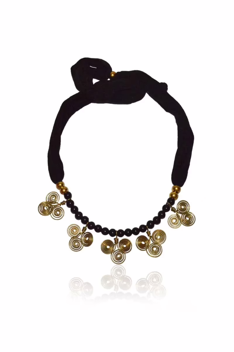 Black and Golden Dokra Festival Necklace Features: Black and Golden intricate with copper material, floral style, beads and black lace.