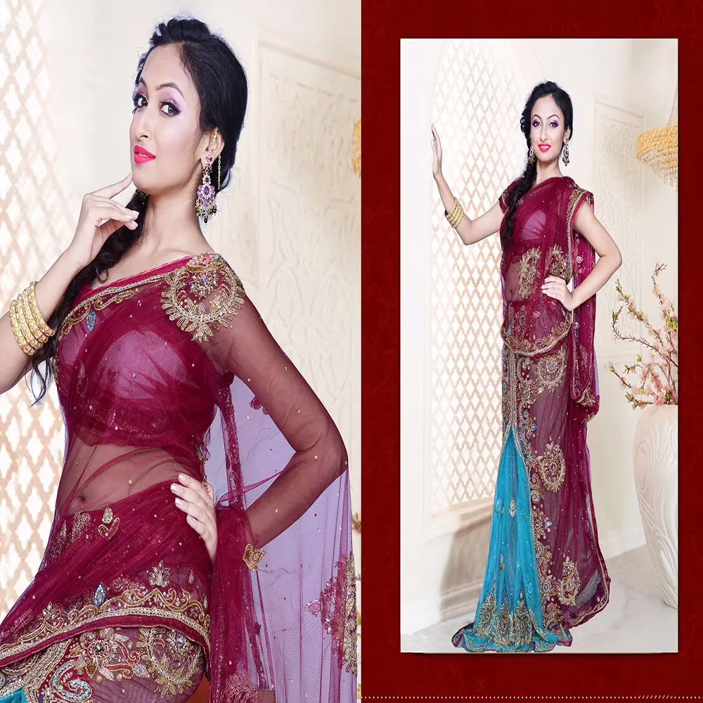 Saree Features : Red-violet embroidered party lehenga style saree intricate with zari thread, floral work, leaf work, beads work, sequins work and border work.Saree comes with a Red-violet unstitch blouse piece of Net fabric which can be customised as per your requirement.