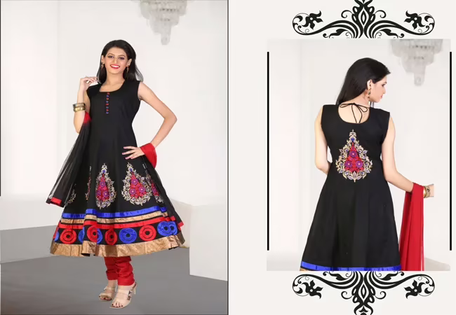 Suit Features Black embroidered party anarkali kameez intricate with resham thread, zari thread, floral work, leaf work, keri work, circular work, patch work, thread style at the back and patch patti border work. This ready made kameez is available upto chest size 42.There is embroidery work done at the back.It comes with the bottom of satin fabric and a dupatta with Chiffon fabric.