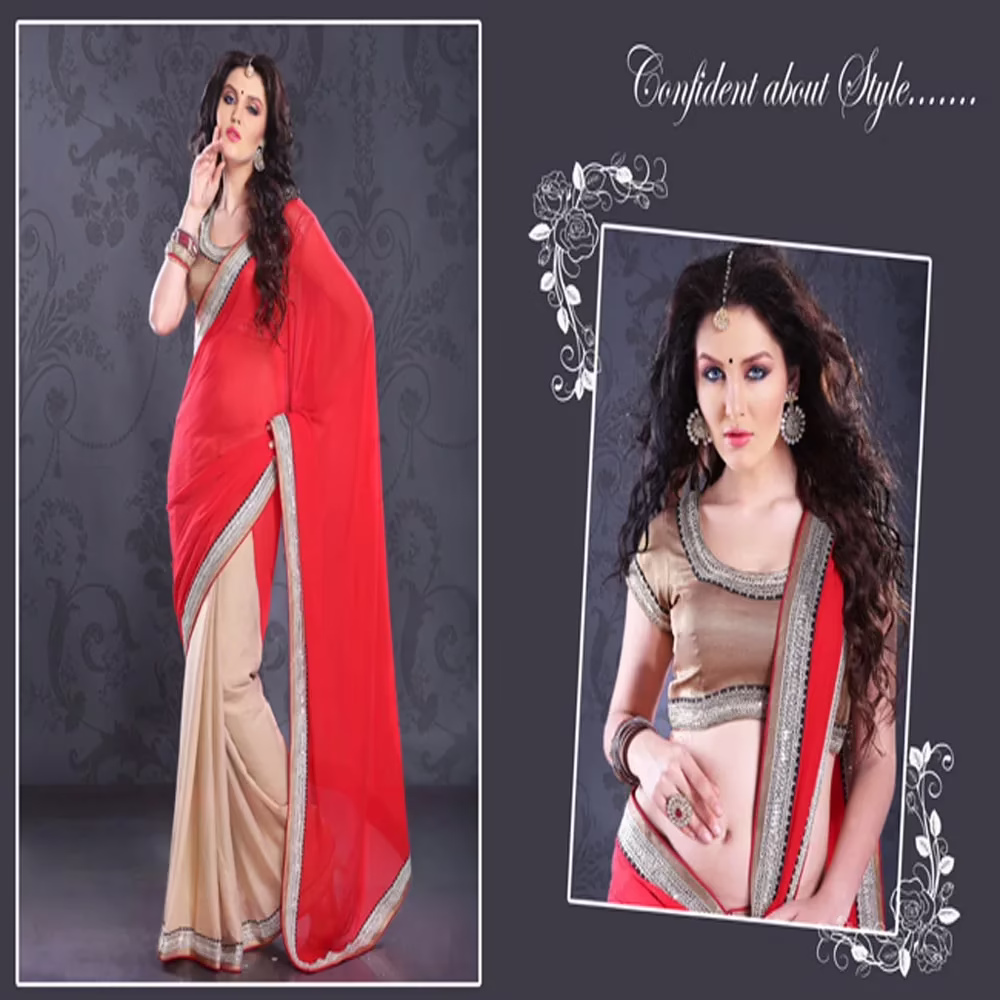 Saree Features .Rose-madder Red and Papaya-whip Yellow embroidered party saree intricate with zari thread, sequins, floral work, leaf work and patch patti border work.Saree comes with an unstitch blouse piece which can be customised as per your requirement. Customisation includes changing front neck style, back neck style, increasing/reducing the length of sleeves.