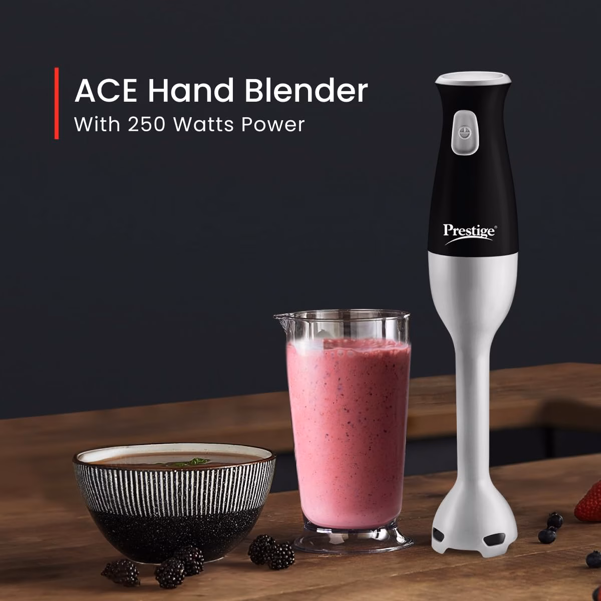 Make your kitchen work lighter with Prestige hand blender. Whether it is whisking, chopping, churning or blending, this Prestige hand blender makes it easy with a push of a button. What? more, the hand blender tops in terms of performance, overall quality and convenience. So now save time and make every preparation easy to make and get perfect results every time with the new Prestige Hand Blender. This Bender comes with an additional chopper bowl, blending jar, whisking attachment and wall hook for easy storage. This kitchen companion comes handy while preparing special meals. Prepare and dish up your recipes fast and easy with this hand blender. Powerful motor with 2 Speed Setting ensures highly efficient performance while consuming power of 250 Watt only. It keeps the blade covered and safe. Prevents direct contact of vessel with blade and thus prevents splashing and liquid from entering shaft. It also helps in longer life of the product. With spring loaded blade now chopping onions, cabbage, greens etc. is easy and convenient. Spring loaded chopping Blade prevents blade from getting stuck and makes chopping effortless, user friendly and safe. Blending Jar has a see through body, with ideal blade fitting shape and liquid quantity measurement marks. It is perfect for making milk shakes, lassi, juices, purees etc. more conveniently than before.