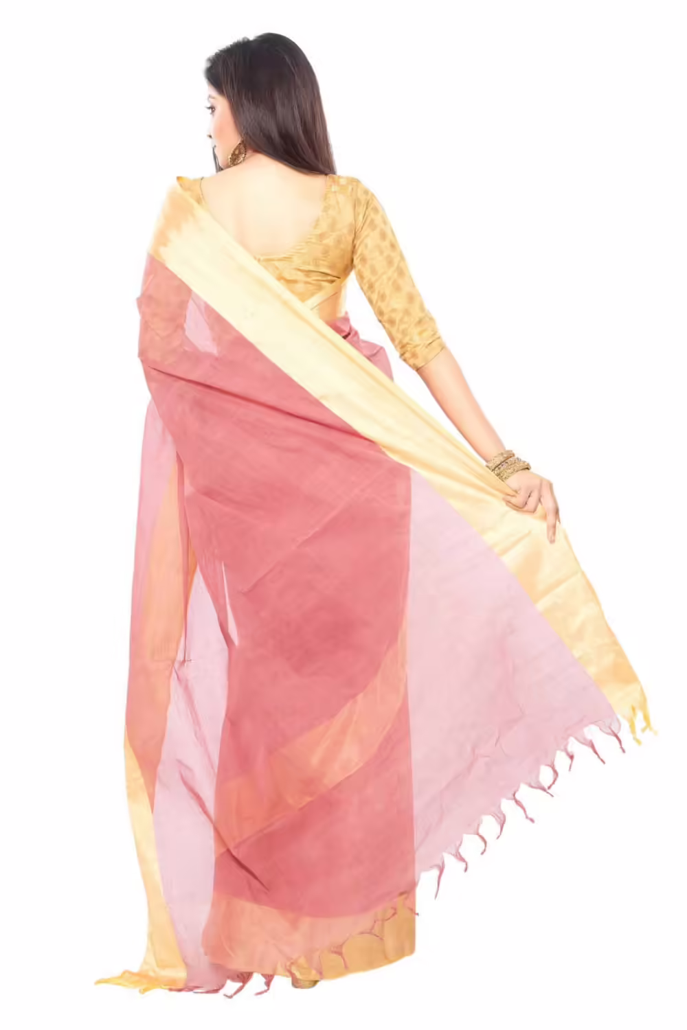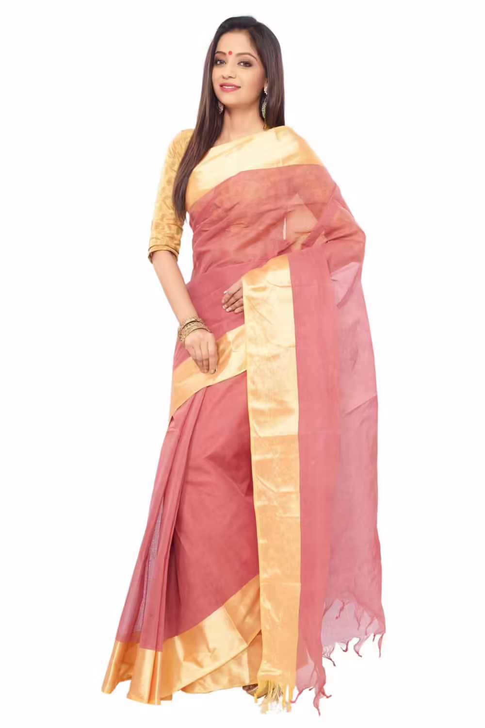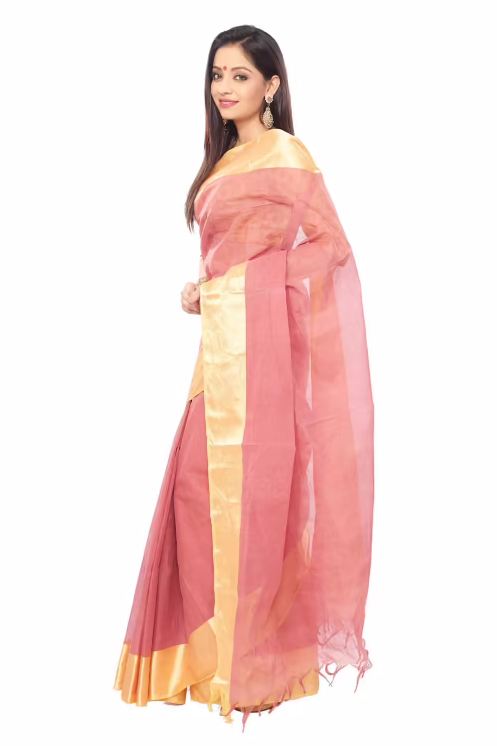 Salmon color Traditional bangal Tant cotton saree with golden Zori Broder and unstitched blouse piece WITH Handloom mark for All AgeGroup Ladies,Girls,Women at Seasonsway.com.