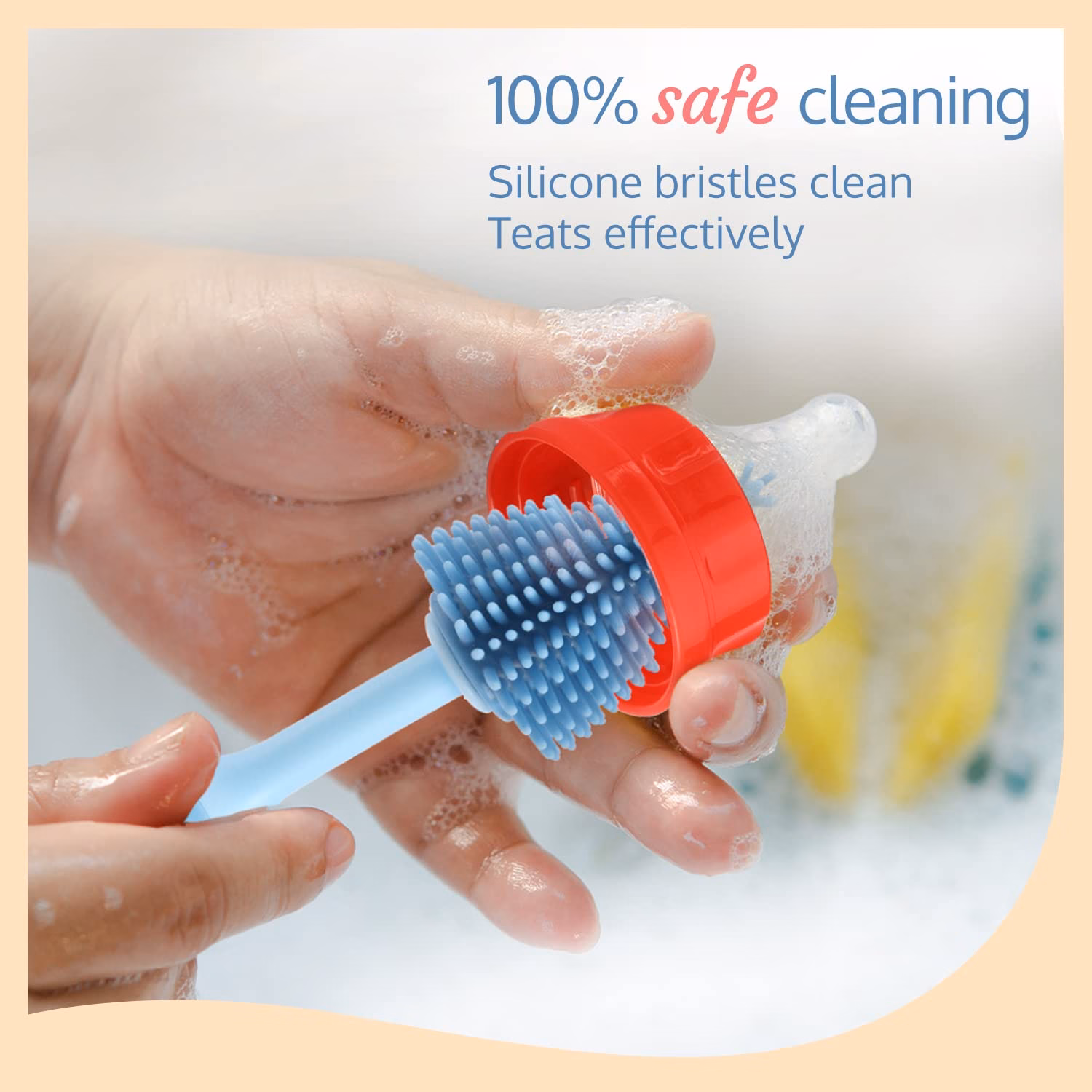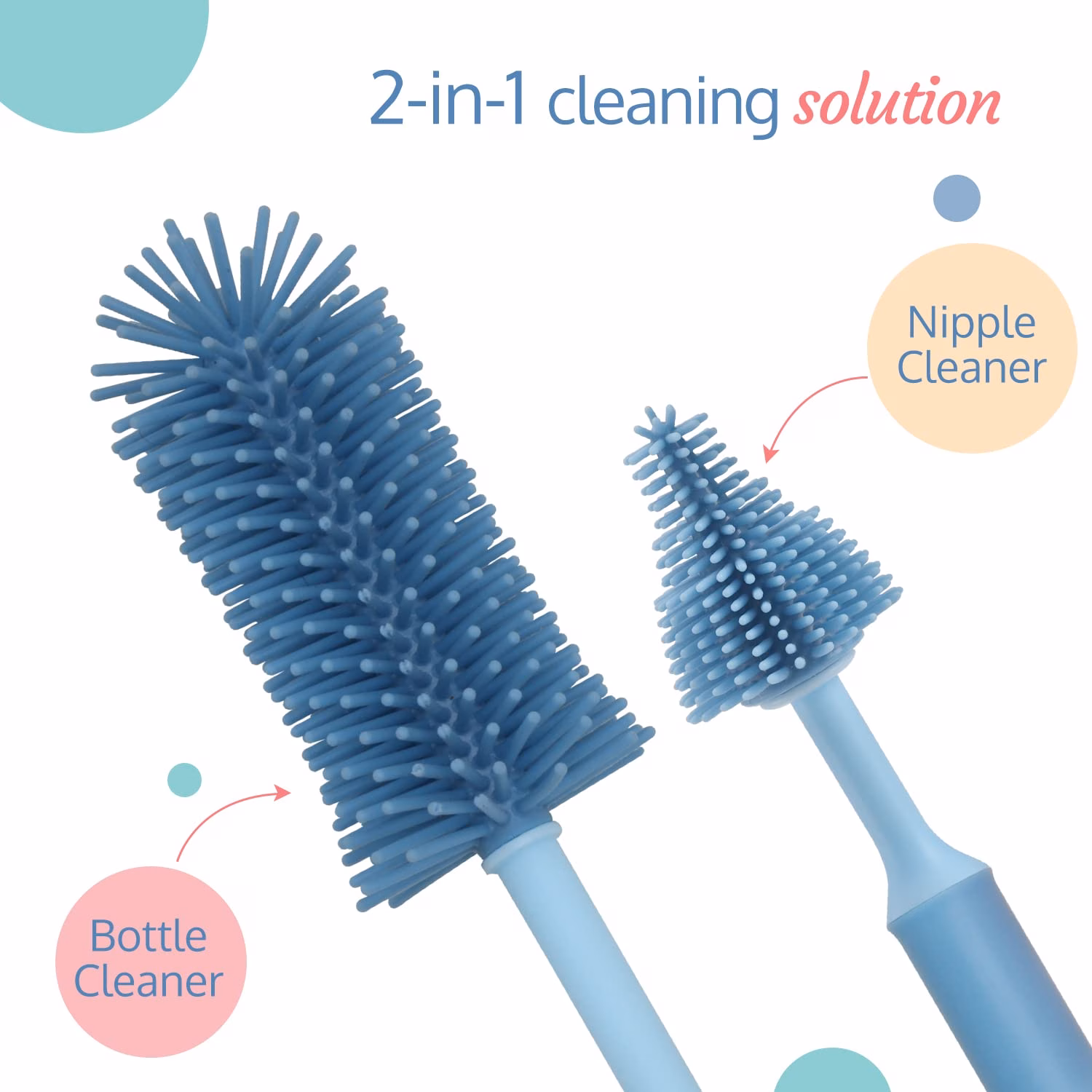 Head of both bottle & Nipple cleaner is made of Highly flexible Non-Toxic Silicone bristles that reach all corners of bottles & accessories ensuring scratch free safe cleaning. Easy Grip 360? rotating brush handle removes stains and harmful bacteria from feeding accessories, baby bottles, bowls, dishes and sippers. Durable silicone bristles attached to sturdy and long lasting core. Can be steam sterilized, BPA-free, durable and to use.
